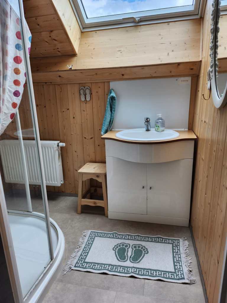 La salle de douche et les toilettes sont sur l’étage, ils sont partagés pour les 2 chambres disponibles.